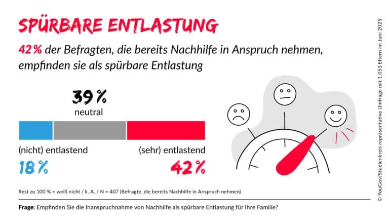 Die Umfrage zeigt: 39 % der Eltern nutzen bereits externe Unterstützung, 42 % von ihnen empfinden Nachhilfe als spürbare Entlastung – nicht nur fachlich, sondern auch emotional. Diese Unterstützung befreit das Familienleben und sorgt für deutlich weniger Stress rund um das Thema Schule.