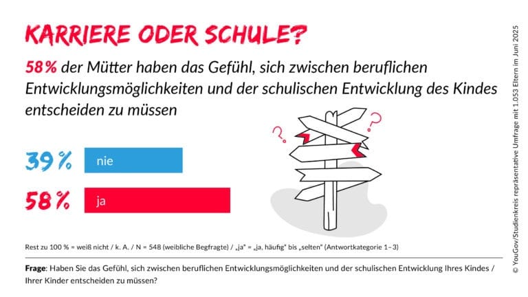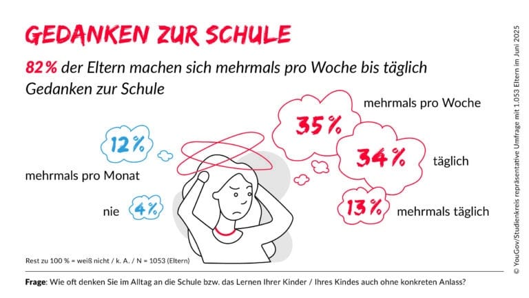 Hausaufgaben, Elternabende, vergessene Vokabeltests – Schule ist in vielen Familien ein Dauerthema. Wie groß dieser Schulstress für die ganze Familie und insbesondere für Mütter tatsächlich ist, möchten wir im Sommer 2025 für unseren Kunden Studienkreis herausfinden. Es ist die Kampagnen-Idee, mit der wir im Pitch überzeugen und das Kernstück unserer nationalen Schulstart-Kommunikation für die Marke Studienkreis. Da es zwar zu Mental Load allgemein bereits einige Studien gibt, zum Einfluss von Schulthemen aber noch keinerlei Daten, beauftragen wir im Auftrag unseres Kunden YouGov mit einer repräsentativen, bundesweiten Umfrage. Im Juni 2025 werden 1.053 Eltern mit schulpflichtigen Kindern befragt. Die Ergebnisse liefern eine deutliche Botschaft, die wach rüttelt: Schulthemen sind gesellschaftlicher Stressfaktor und halten Frauen in großem Maße sogar von ihrer Karriere ab.