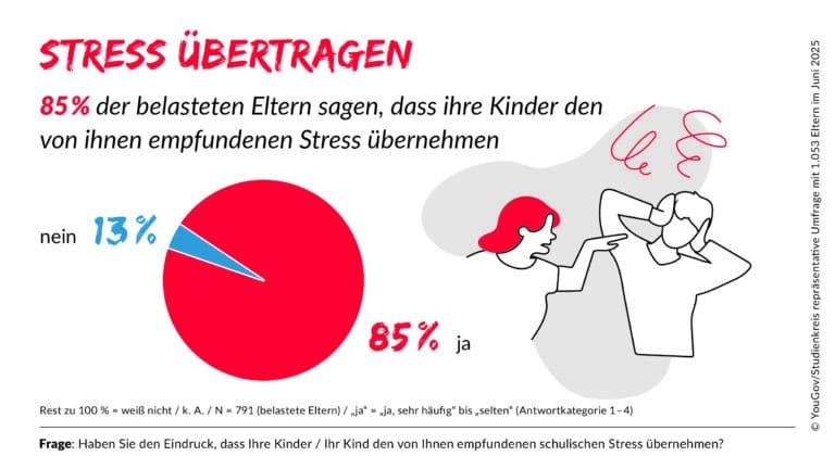 Schulstress wirkt in der Familie in viele Richtungen. 64 % der befragten Eltern berichten, dass schulische Themen zu Spannungen in der Partnerschaft führen. Noch deutlicher: 85 % nehmen wahr, dass ihre Kinder den Stress der Eltern übernehmen. Eine stille Kettenreaktion, die im Alltag oft übersehen wird. Um diesem Problem entgegenzuwirken, ist es wichtig, dass Eltern nicht in die Lehrer:innen-Rolle schlüpfen, sondern in der Eltern-Rolle bleiben und das Kind in dieser unterstützen. „Denn ein Kind emotional zu begleiten und aufzufangen – dafür sind die Eltern zuständig“, rät Laura Fröhlich.