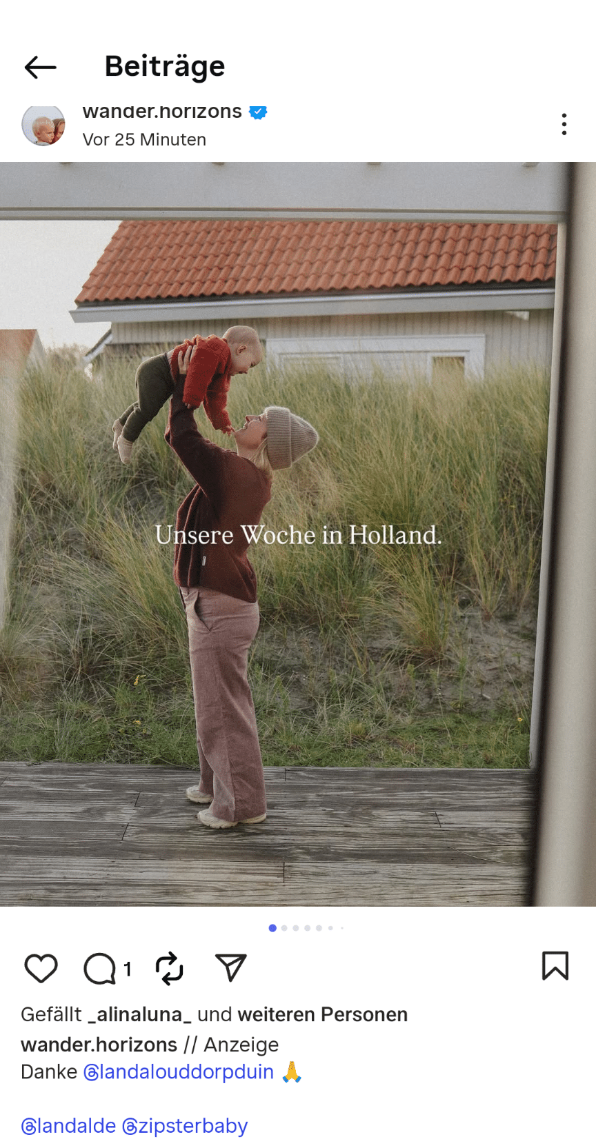 The content resonates: Followers comment enthusiastically on the Zipster outfits and praise the Landal holiday parks. Both brands share the posts on their own channels, thereby increasing the visibility of the campaign. The collaboration achieves a reach of over 300,000 across all assets and demonstrates how effective influencer marketing is in family communication.